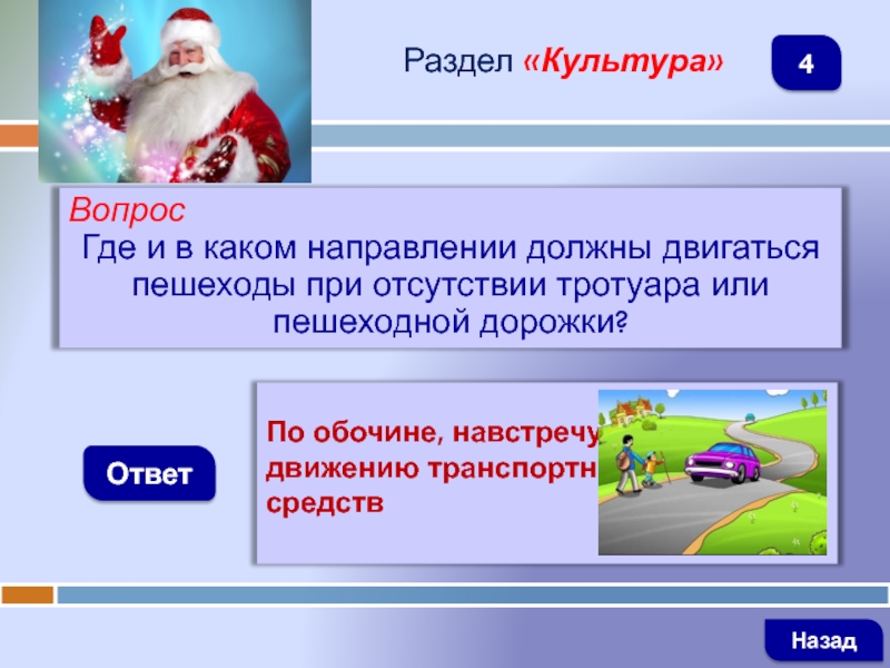 ВопросГде и в каком направлении должны двигаться пешеходы при отсутствии тротуара или пешеходной дорожки?ОтветРаздел «Культура»По обочине, навстречу