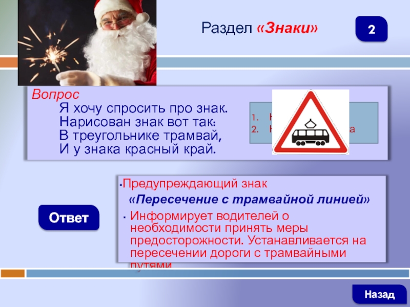 ВопросЯ хочу спросить про знак.Нарисован знак вот так:В треугольнике трамвай,И у знака красный край.ОтветРаздел «Знаки»Предупреждающий знак