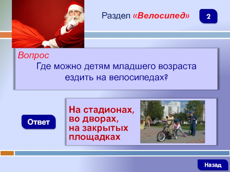 ВопросГде можно детям младшего возраста ездить на велосипедах?ОтветРаздел «Велосипед»На стадионах, во дворах, на закрытых площадкахНазад2