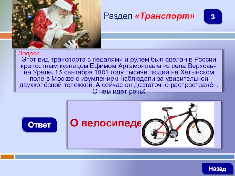 ВопросЭтот вид транспорта с педалями и рулём был сделан в России крепостным кузнецом Ефимом Артамоновым из села