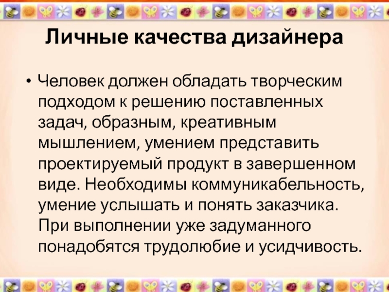 Личные качества дизайнера Человек должен обладать творческим подходом к решению поставленных задач, образным, креативным мышлением, умением