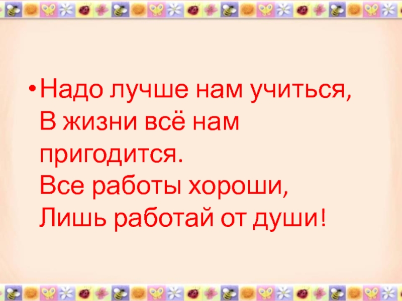 Надо лучше нам учиться,  В жизни всё нам пригодится.  Все работы хороши,  Лишь работай