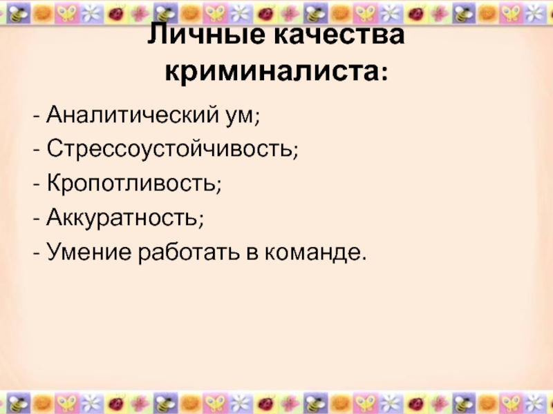 Личные качества криминалиста: - Аналитический ум;- Стрессоустойчивость;- Кропотливость;- Аккуратность;- Умение работать в команде.