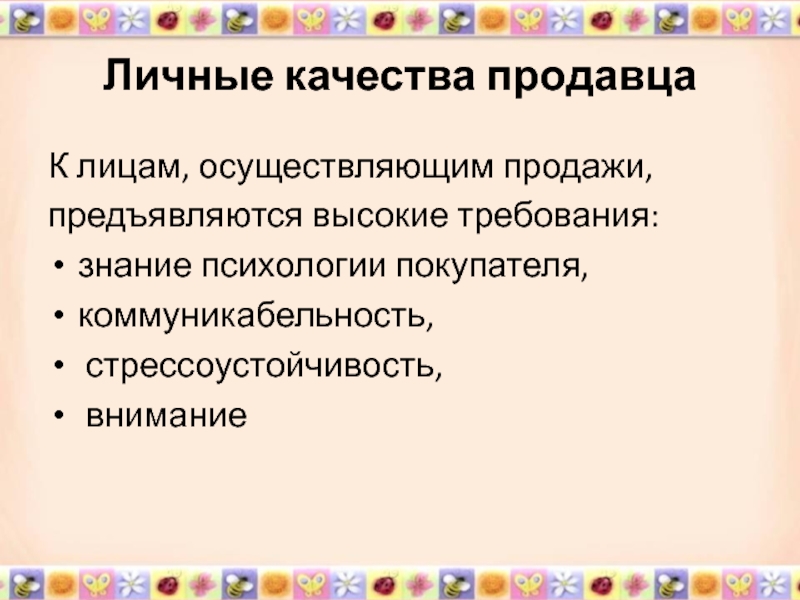 Личные качества продавца К лицам, осуществляющим продажи,предъявляются высокие требования:знание психологии покупателя,коммуникабельность, стрессоустойчивость, внимание