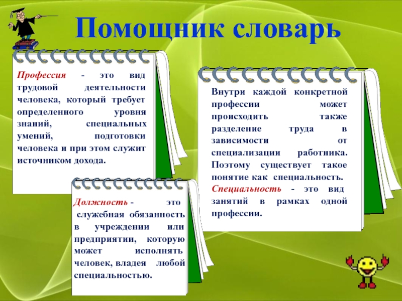 Внутри каждой конкретной профессии может происходить также разделение труда в зависимости от специализации работника. Поэтому существует такое понятие как специальность.