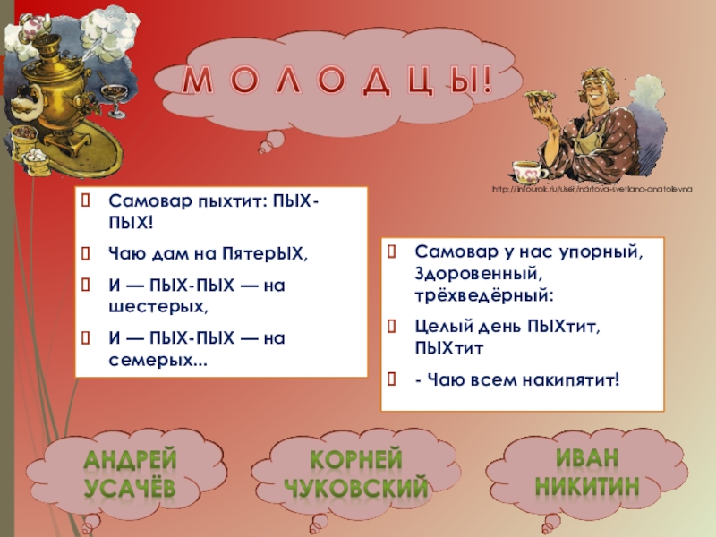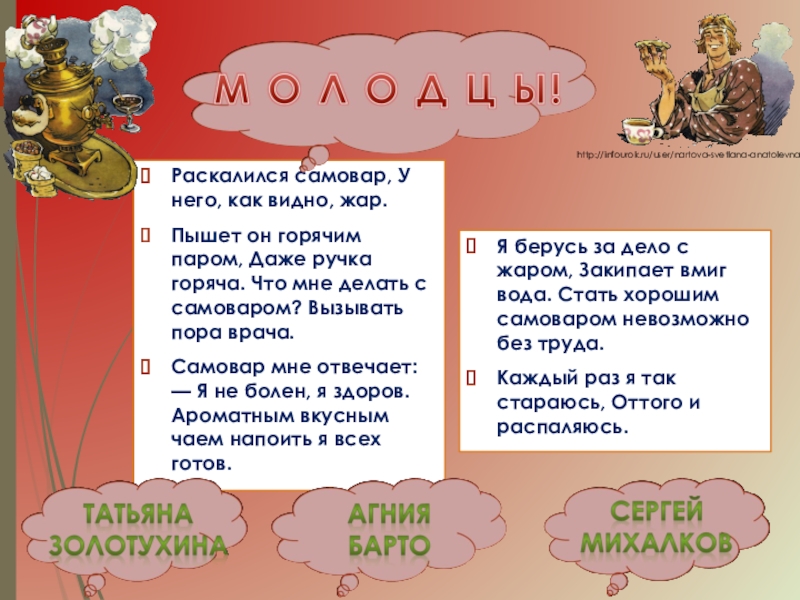 Я берусь за дело с жаром, Закипает вмиг вода. Стать хорошим самоваром невозможно без труда.