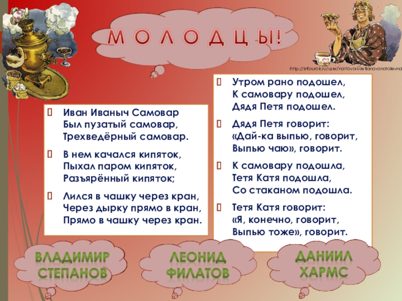 Самовар у нас упорный, Здоровенный, трёхведёрный: