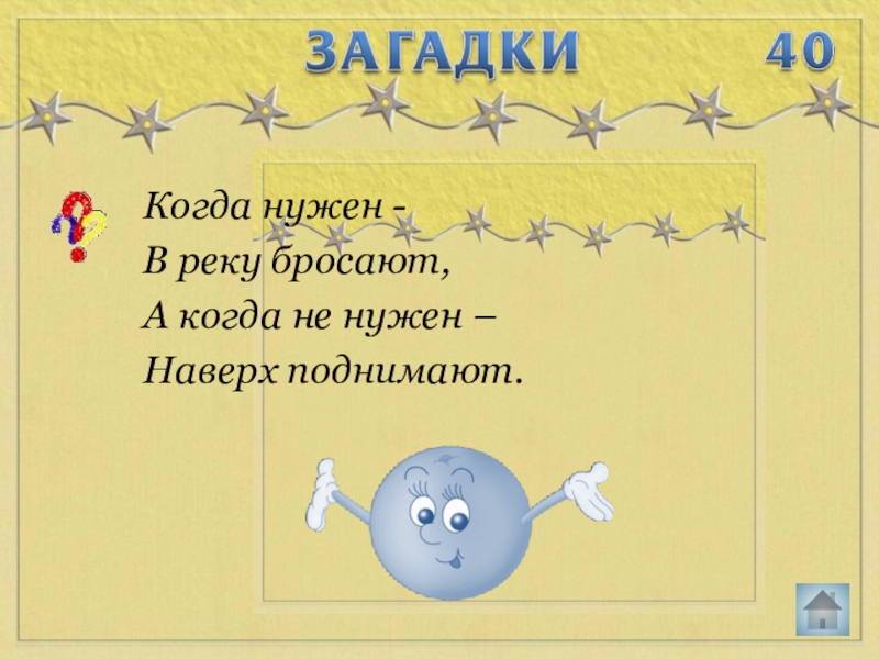 Когда нужен - В реку бросают,А когда не нужен –Наверх поднимают.