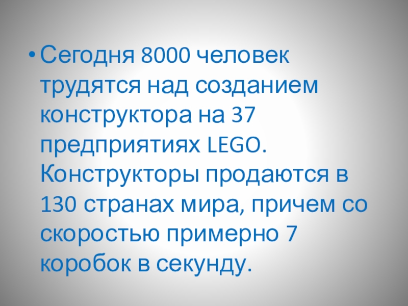 Слайд 6Сегодня 8000 человек трудятся над созданием конструктора на 37 предприятиях LEGO.