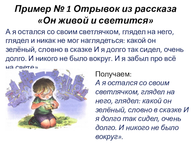 А я остался со своим светлячком, глядел на него, глядел: какой он зелёный, словно в сказке И я долго так сидел, очень долго. И никого не было вокруг».