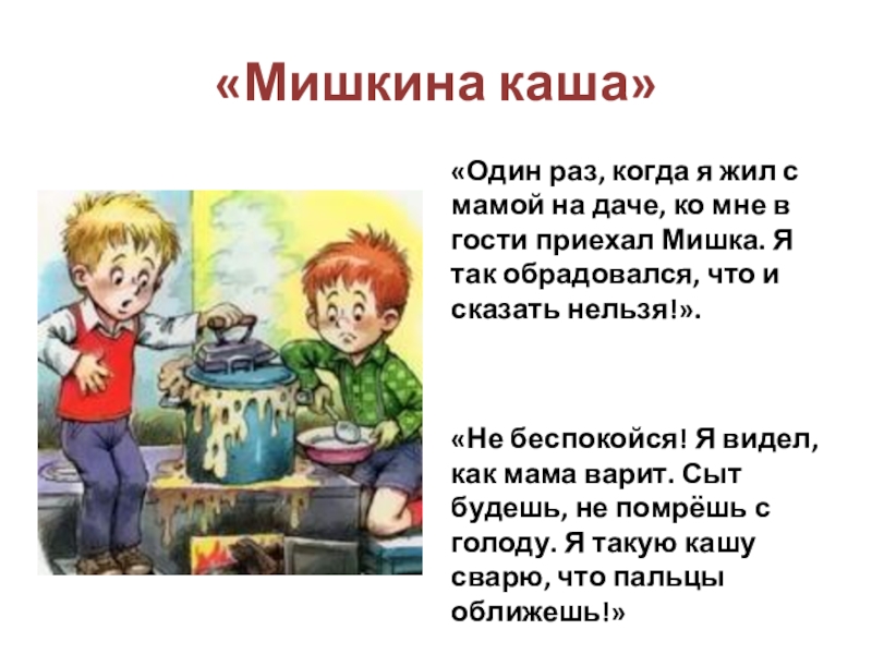 «Не беспокойся! Я видел, как мама варит. Сыт будешь, не помрёшь с голоду. Я такую кашу сварю, что пальцы оближешь!»