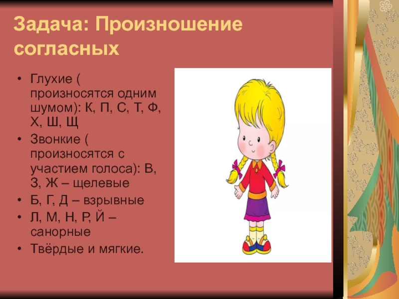Задача: Произношение согласных Глухие ( произносятся одним шумом): К, П, С, Т, Ф, Х, Ш, ЩЗвонкие (