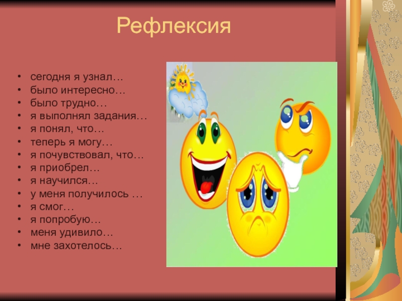 Рефлексиясегодня я узнал…было интересно…было трудно…я выполнял задания…я понял, что…теперь я могу…я почувствовал, что…я приобрел…я научился…у меня получилось