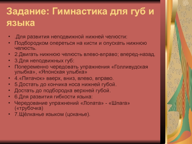 Задание: Гимнастика для губ и языка .Для развития неподвижной нижней челюсти:Подбородком опереться на кисти и опускать нижнюю