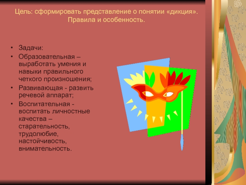 Цель: сформировать представление о понятии «дикция». Правила и особенность.Задачи:Образовательная – выработать умения и навыки правильного четкого произношения;Развивающая - развить речевой аппарат; Воспитательная - воспитать личностные качества – старательность, трудолюбие, настойчивость, внимательность.
