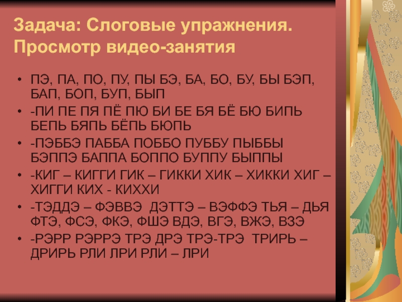 Слайд 7Задача: Слоговые упражнения. Просмотр видео-занятия