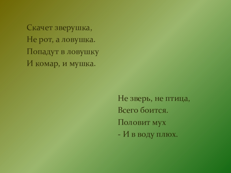 Скачет зверушка,Не рот, а ловушка.Попадут в ловушкуИ комар, и мушка. Не зверь, не птица,Всего боится.Половит мух -