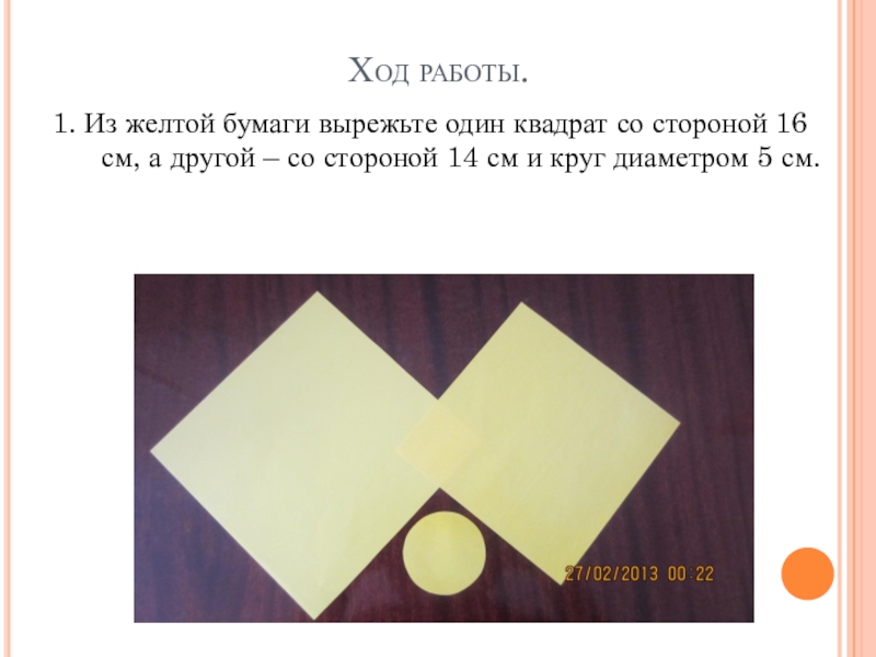 Ход работы.1. Из желтой бумаги вырежьте один квадрат со стороной 16 см, а другой – со стороной
