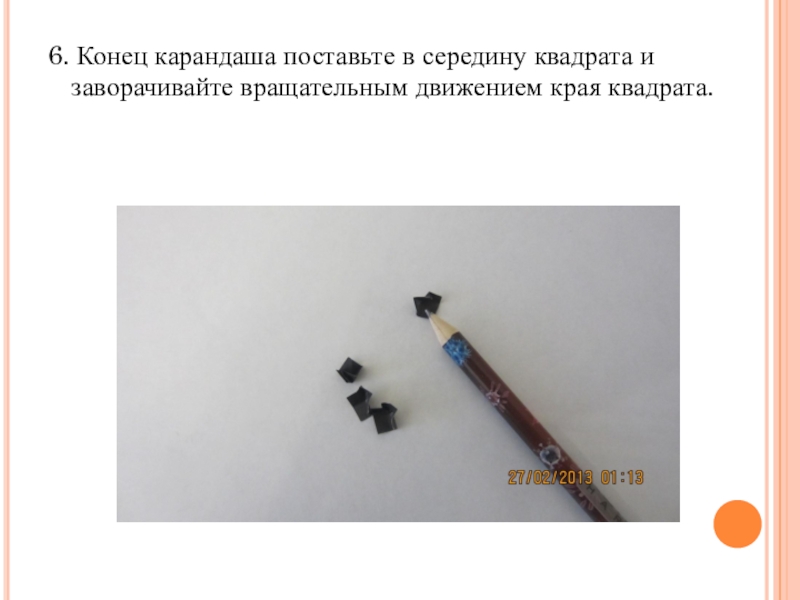6. Конец карандаша поставьте в середину квадрата и заворачивайте вращательным движением края квадрата.