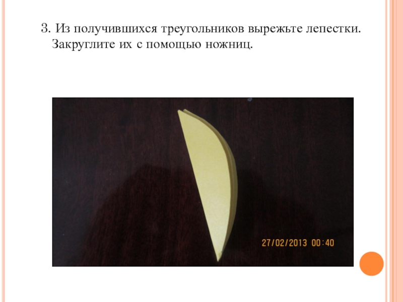 Слайд 73. Из получившихся треугольников вырежьте лепестки. Закруглите их с помощью ножниц.