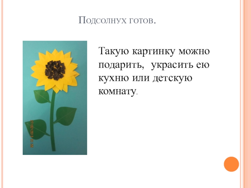 Подсолнух готов.Такую картинку можноподарить, украсить ею кухню или детскую комнату.