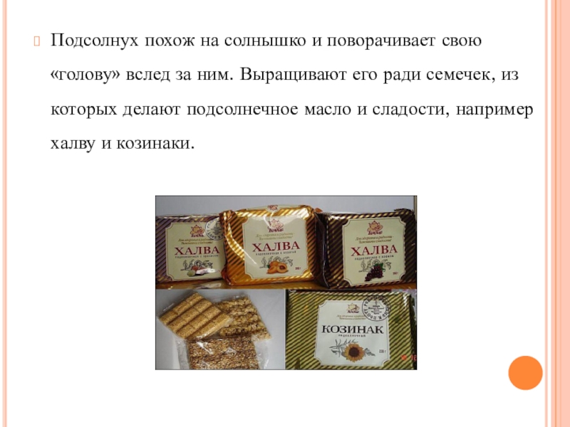 Выращивают его ради семечек, из которых делают подсолнечное масло и сладости, например халву и козинаки.