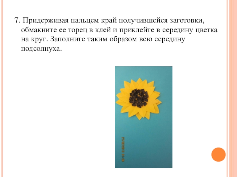 и приклейте в середину цветка на круг. Заполните таким образом всю середину подсолнуха.