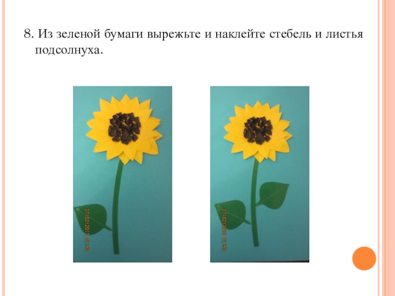 Слайд 128. Из зеленой бумаги вырежьте и наклейте стебель и листья подсолнуха.