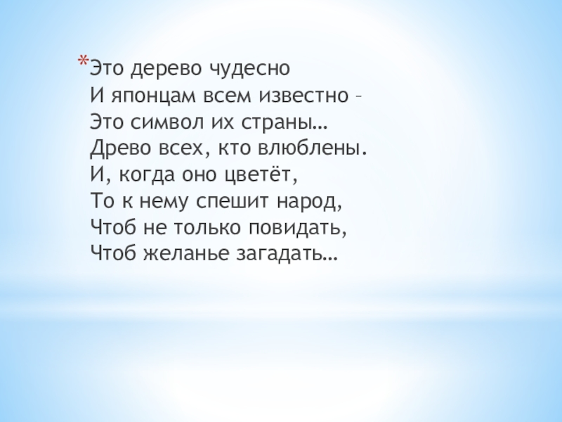 Это дерево чудесно И японцам всем известно – Это символ их страны… Древо всех, кто влюблены. И,