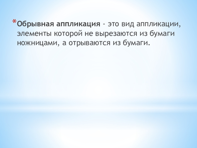 Обрывная аппликация - это вид аппликации, элементы которой не вырезаются из бумаги ножницами, а отрываются из бумаги.