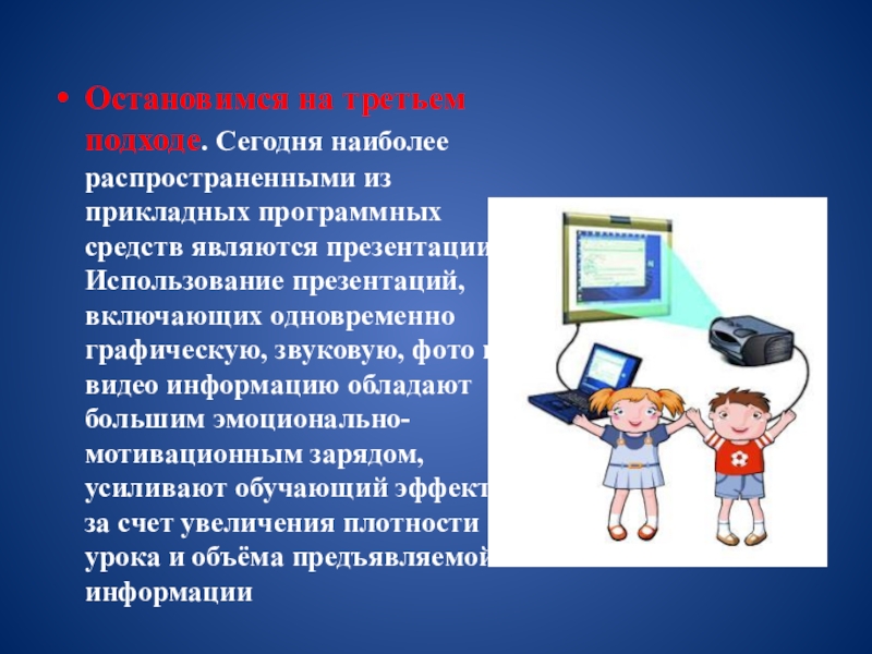 являются презентации. Использование презентаций, включающих одновременно графическую, звуковую, фото и видео информацию обладают большим эмоционально-мотивационным зарядом, усиливают обучающий эффект за счет увеличения плотности урока и объёма предъявляемой информации