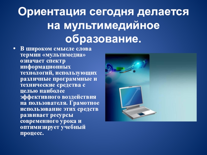 Слайд 8Ориентация сегодня делается на мультимедийное образование.