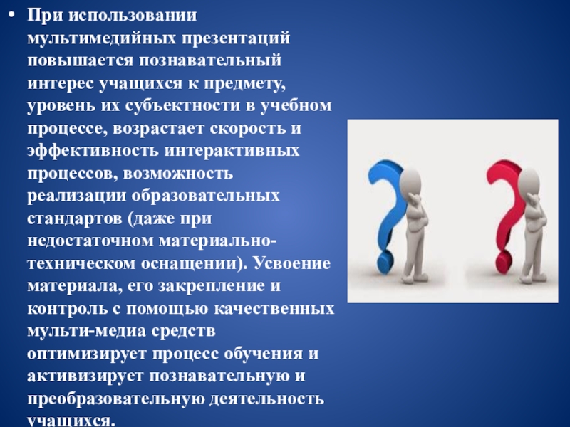 Слайд 16При использовании мультимедийных презентаций повышается познавательный интерес учащихся к предмету, уровень