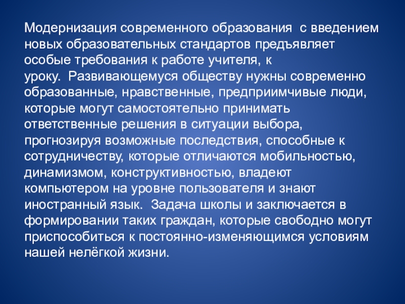 к работе учителя, к уроку. Развивающемуся обществу нужны современно образованные, нравственные, предприимчивые люди, которые могут самостоятельно принимать ответственные решения в ситуации выбора, прогнозируя возможные последствия, способные к сотрудничеству, которые отличаются мобильностью, динамизмом, конструктивностью, владеют компьютером на уровне пользователя и знают иностранный язык. Задача школы и заключается в формировании таких граждан, которые свободно могут приспособиться к постоянно-изменяющимся условиям нашей нелёгкой жизни.