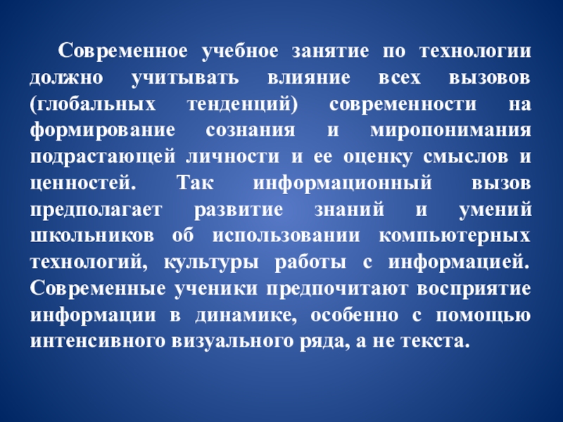 тенденций) современности на формирование сознания и миропонимания подрастающей личности и ее оценку смыслов и ценностей. Так информационный вызов предполагает развитие знаний и умений школьников об использовании компьютерных технологий, культуры работы с информацией. Современные ученики предпочитают восприятие информации в динамике, особенно с помощью интенсивного визуального ряда, а не текста.