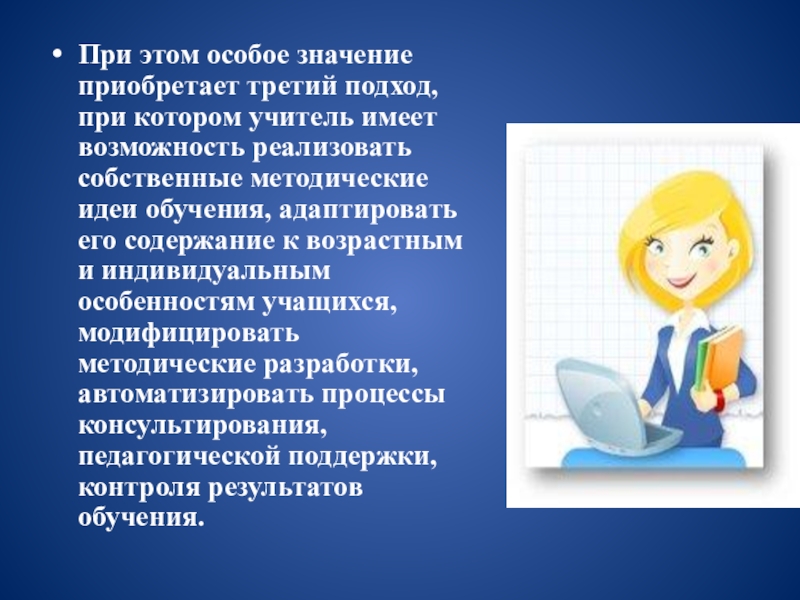 Слайд 10При этом особое значение приобретает третий подход, при котором учитель имеет