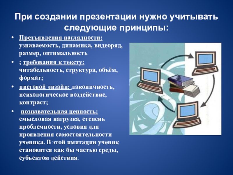 Слайд 14При создании презентации нужно учитывать следующие принципы: