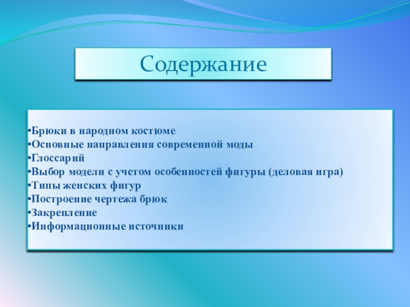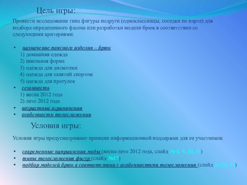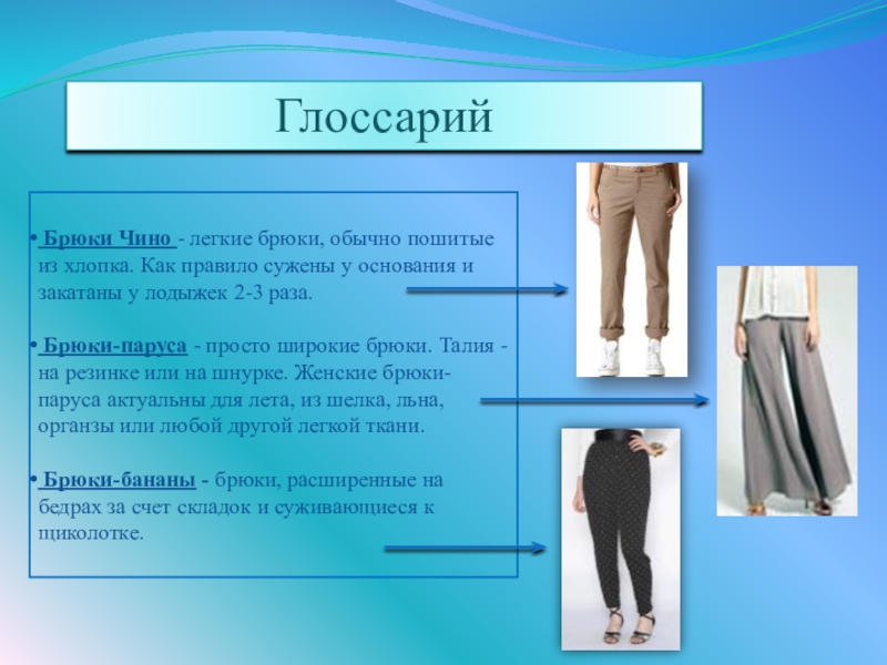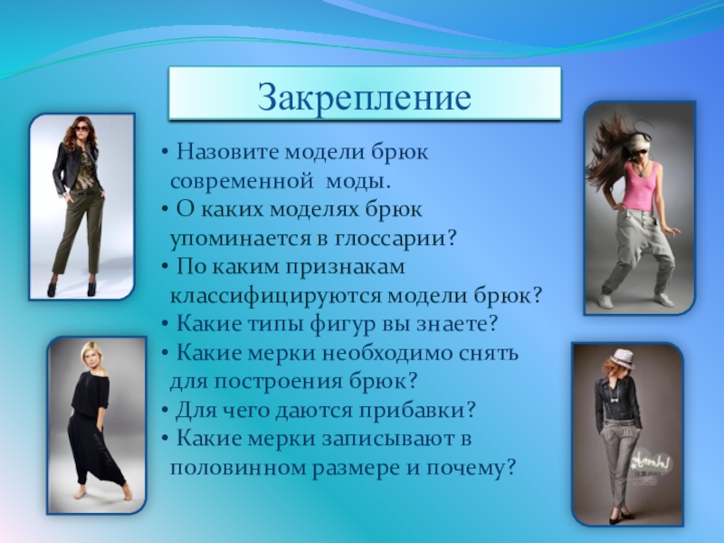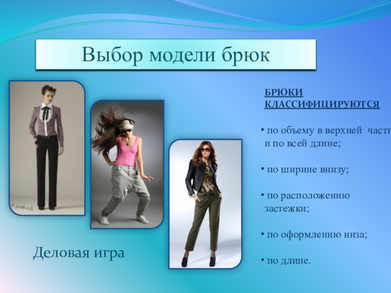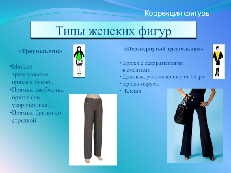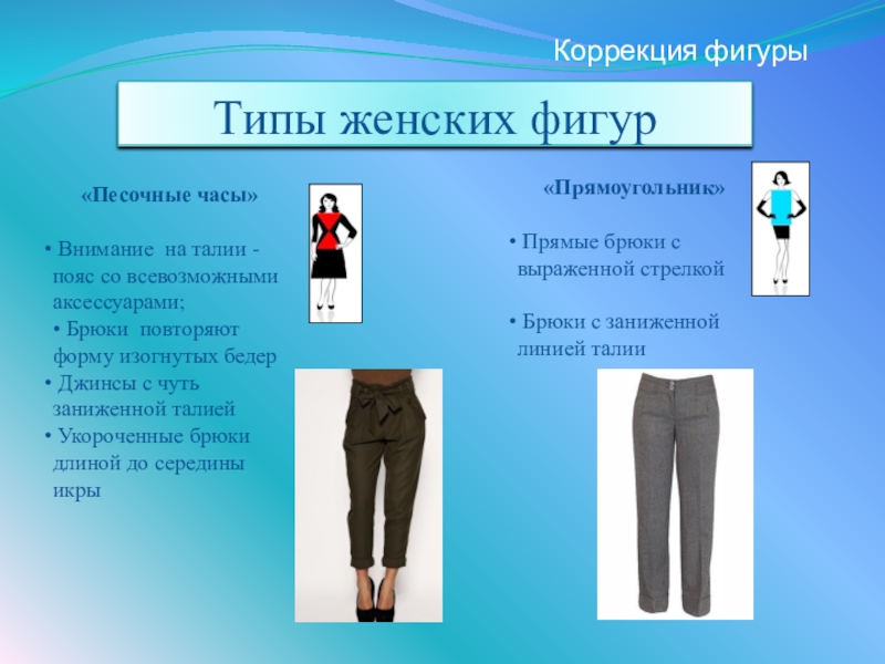 подбор моделей брюк в соответствии с особенностями телосложения (слайд № 18, 19)