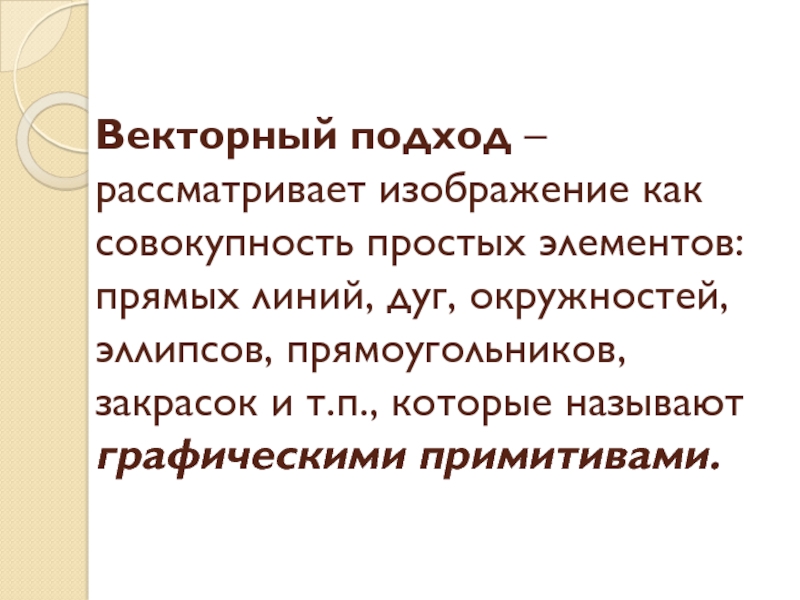 Слайд 5Векторный подход – рассматривает изображение как совокупность простых элементов: прямых линий,