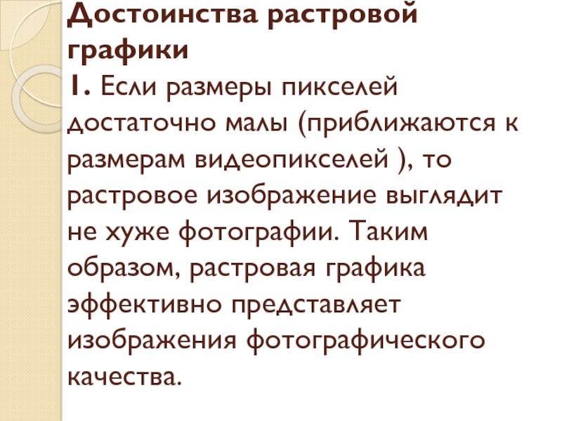 размерам видеопикселей ), то растровое изображение выглядит не хуже фотографии. Таким образом, растровая графика эффективно представляет изображения фотографического качества.