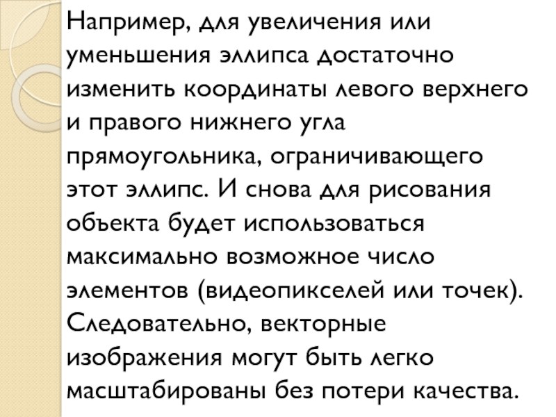 и правого нижнего угла прямоугольника, ограничивающего этот эллипс. И снова для рисования объекта будет использоваться максимально возможное число элементов (видеопикселей или точек). Следовательно, векторные изображения могут быть легко масштабированы без потери качества.