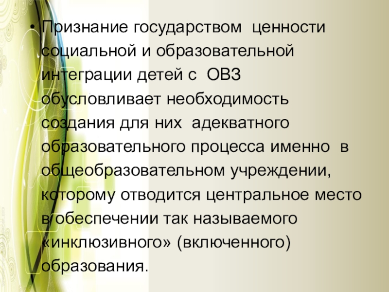Слайд 3Признание государством  ценности социальной и образовательной интеграции детей с  ОВЗ обусловливает необходимость создания