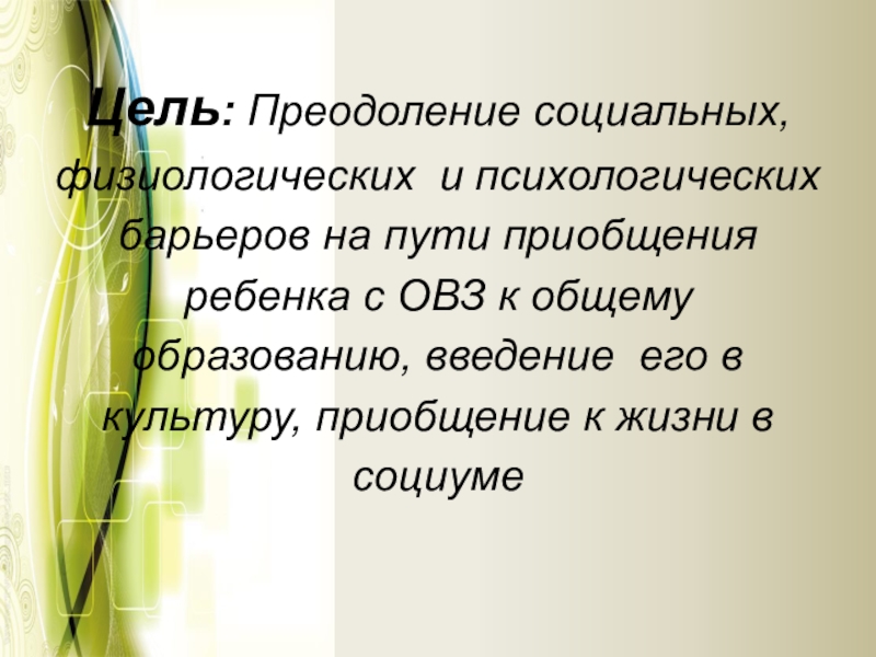 Цель: Преодоление социальных, физиологических  и психологических барьеров на пути приобщения ребенка с ОВЗ к общему образованию, введение его