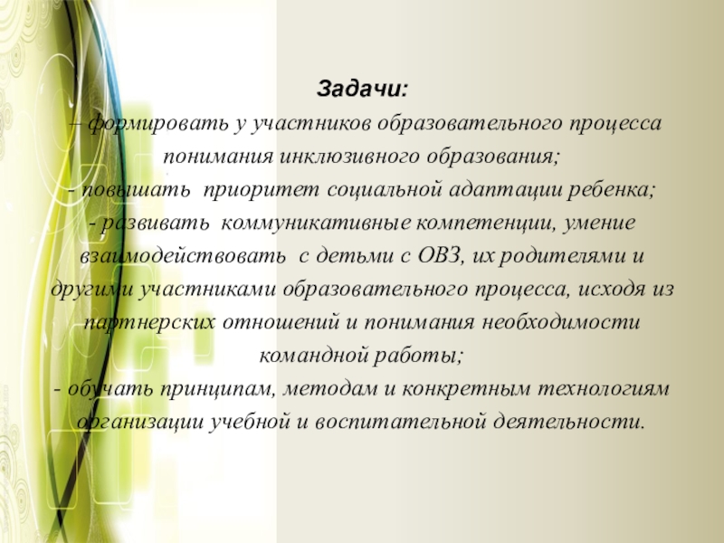Слайд 6 Задачи: – формировать у участников образовательного процесса понимания инклюзивного образования; - повышать