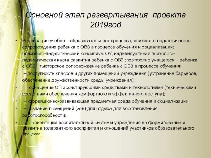 Основной этап развертывания проекта 2019годРеализация учебно – образовательного процесса, психолого-педагогическое сопровождение ребенка с ОВЗ в процессе обучения