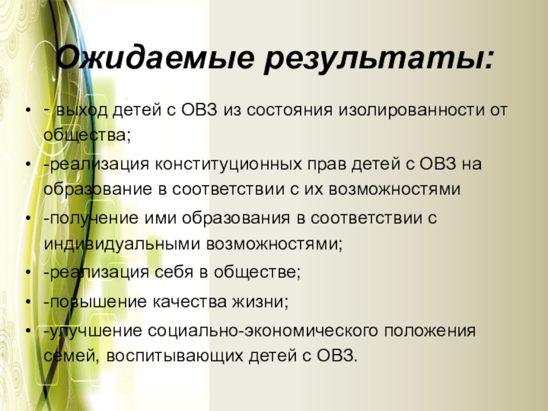 Ожидаемые результаты: - выход детей с ОВЗ из состояния изолированности от общества;-реализация конституционных прав детей с ОВЗ