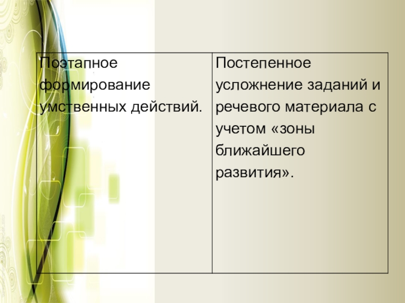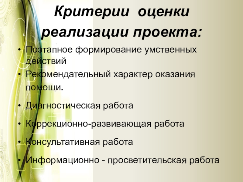 Критерии  оценки реализации проекта: Поэтапное формирование умственных действийРекомендательный характер оказания помощи. Диагностическая работа Коррекционно-развивающая работа Консультативная работа Информационно - просветительская