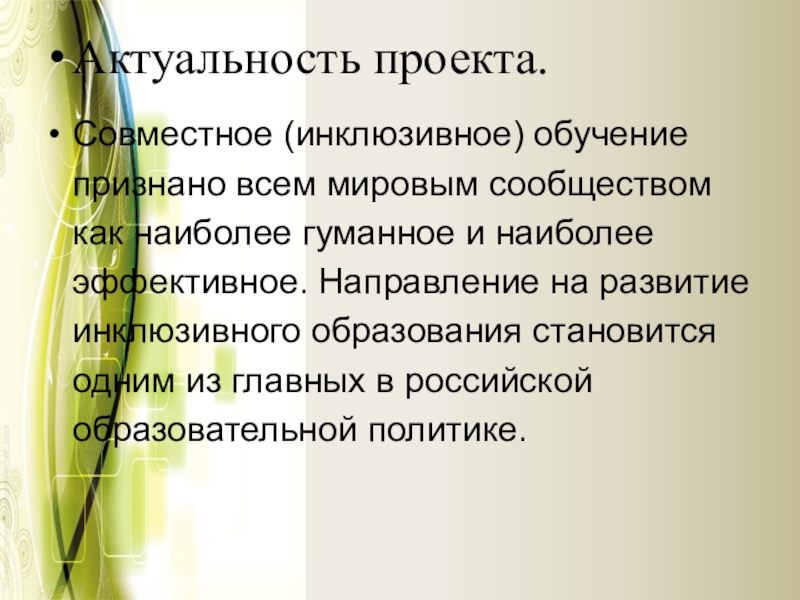 Актуальность проекта.Совместное (инклюзивное) обучение признано всем мировым сообществом как наиболее гуманное и