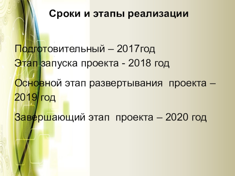 Сроки и этапы реализации Подготовительный – 2017годЭтап запуска проекта - 2018 годОсновной этап развертывания проекта – 2019