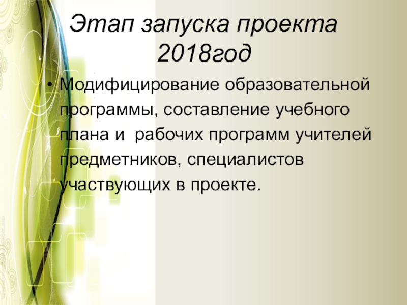Этап запуска проекта  2018годМодифицирование образовательной программы, составление учебного плана и рабочих программ учителей предметников, специалистов участвующих в